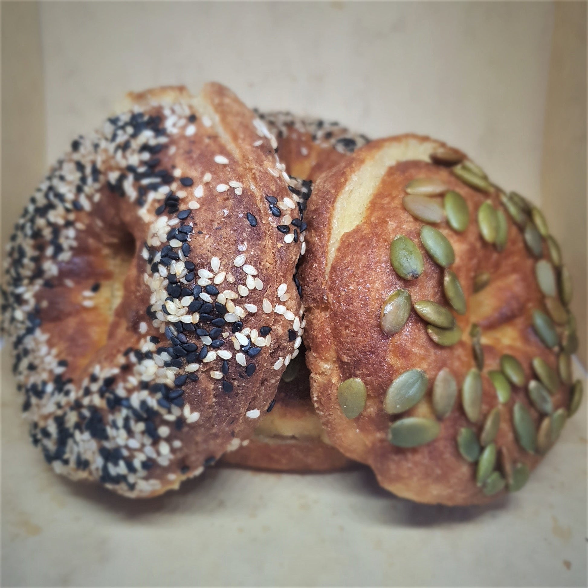 Ingredients: Mozzarella, Cream Cheese, Eggs, Ground Almonds, Coconut Flour, Baking Powder, Pumpkin Seeds, Sesame Seeds