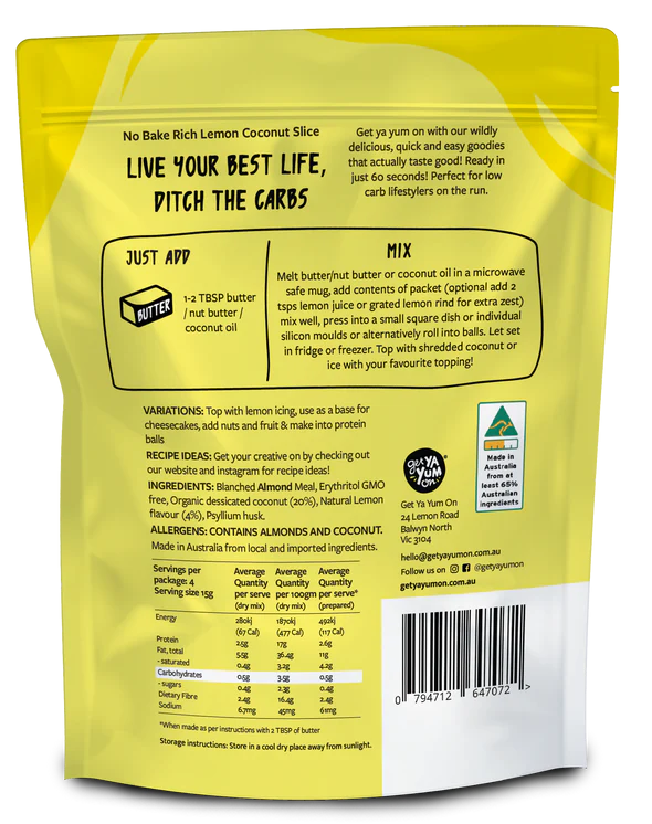 JUST ADD: 2-3 TBSPs of Grass-fed melted butter, or vegan butter (Nuttalex or similar) to the packet mix, (add 2 tsp lemon juice or grated lemon rind for extra zest - optional) press into small square silicon moulds, let set in the fridge for a few minutes, eat as is or top or roll in shredded coconut, or your favourite keto lemon icing.