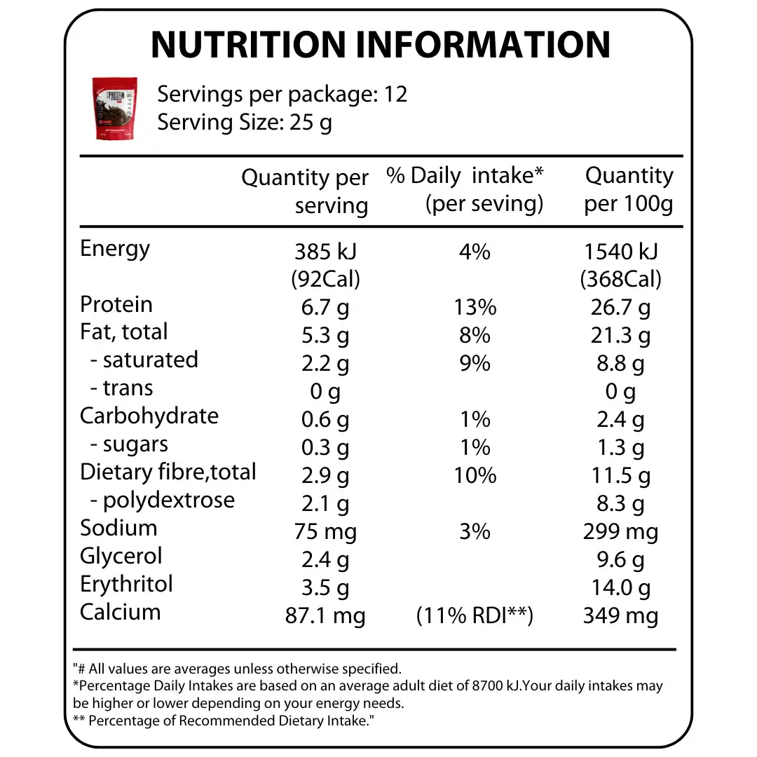 Each delicious cookie comes in a 25g individually wrapped serve for added convenience & is ultra low in carbs, just 0.6 g per serve. Yes very low in carbs indeed but higher in the good stuff with 6.7 g of protein & additional benefits of delivering you 10% DI of your fibre needs & 11% RDI of your calcium needs per cookie.