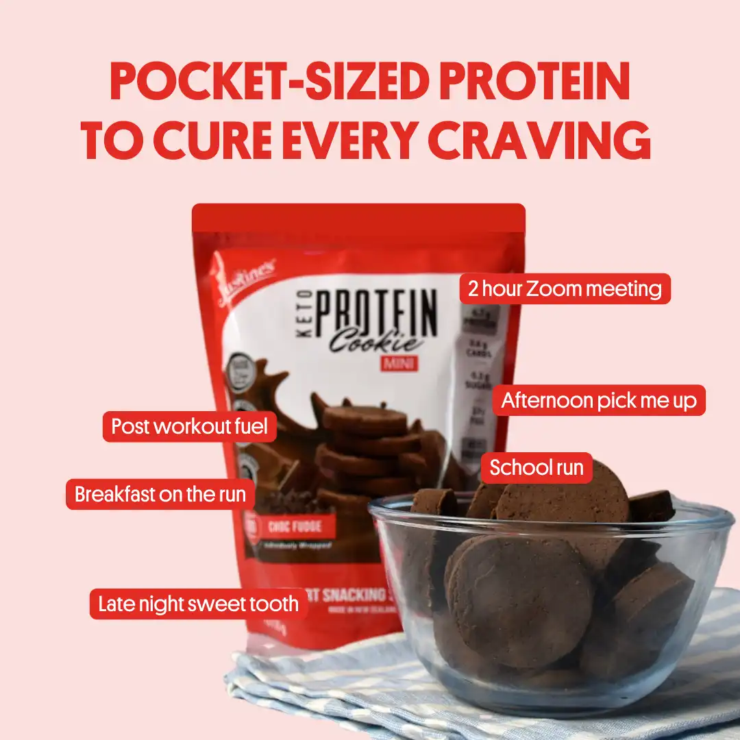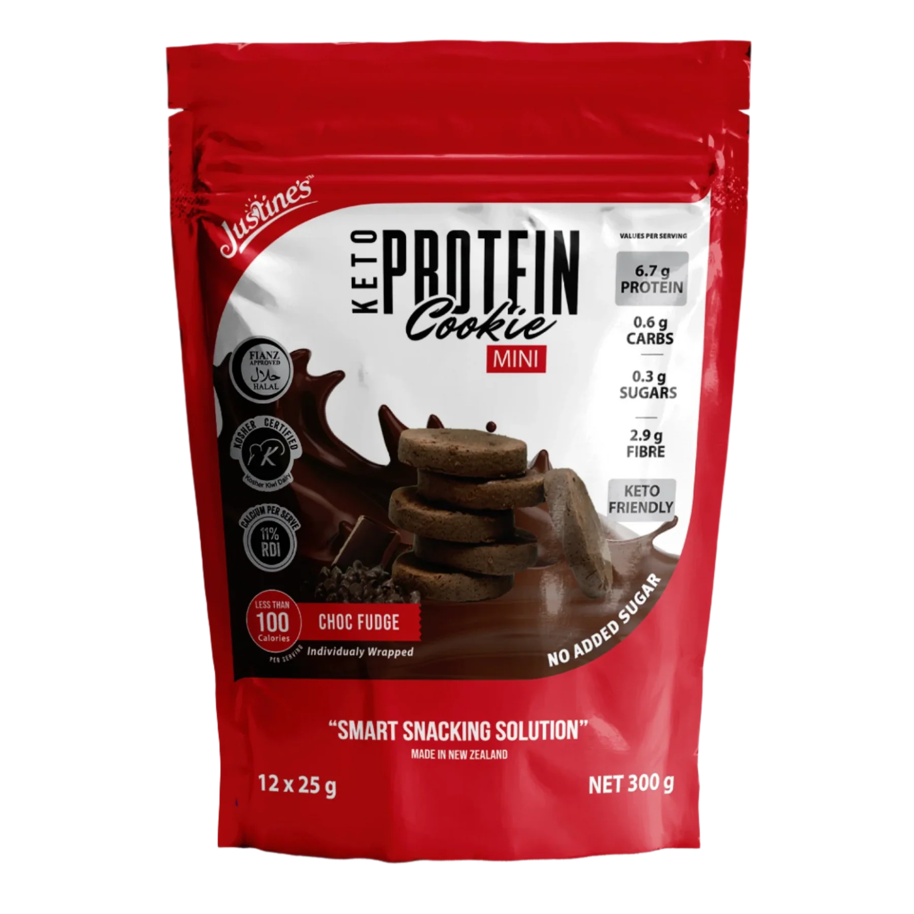 For all chocolate lovers who are wanting guilt free, keto smarter snacking solutions. Meet your new Justine's Choc Fudge Mini protein cookie. A moreish chocolate based cookie with a rich fudge flavour & studded with no added sugar choc chips which will provide you with a delightful indulgent experience.