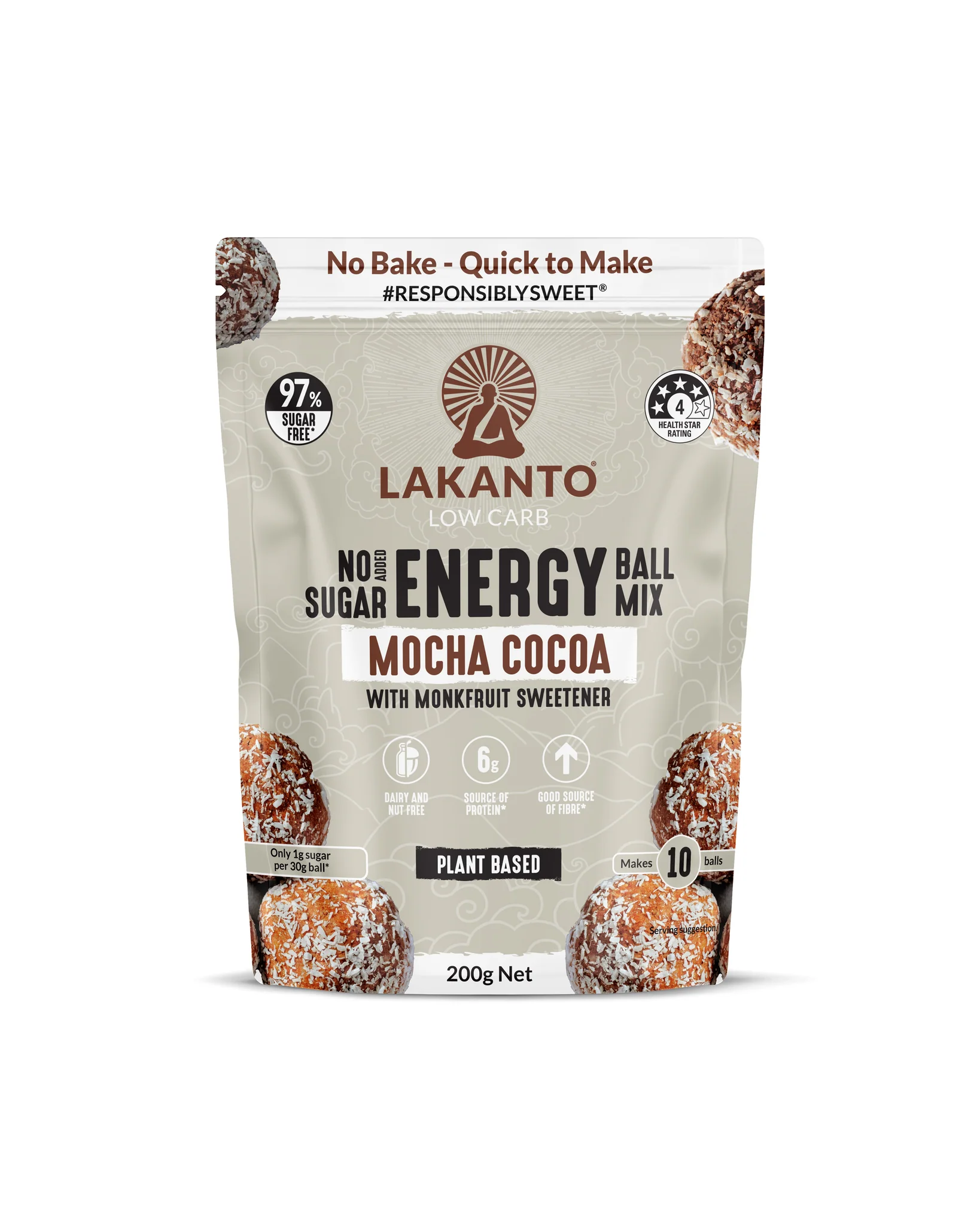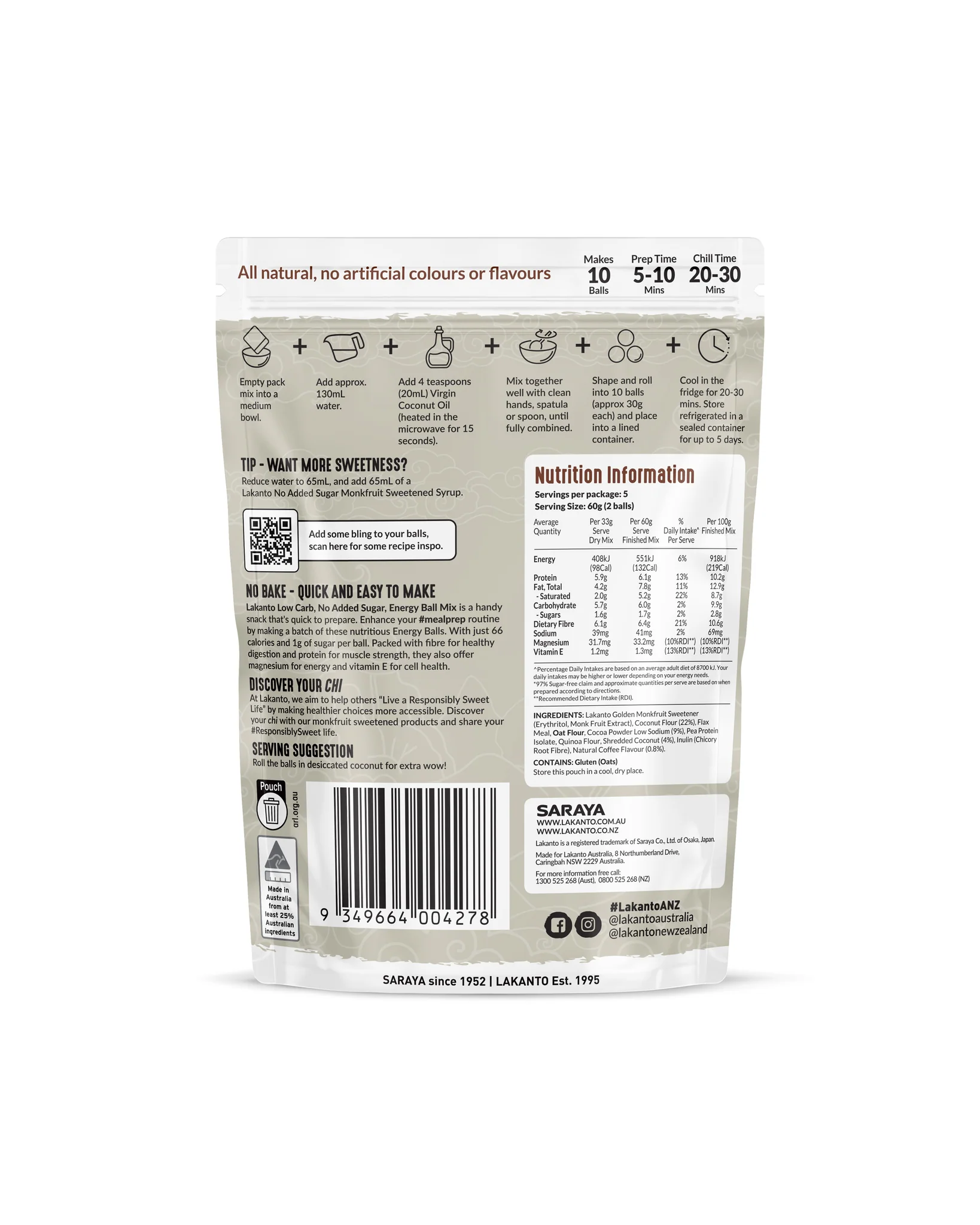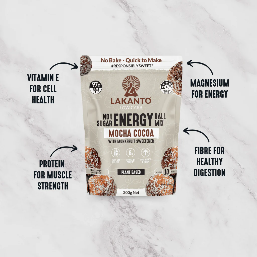 - Lakanto Low Carb, No Added Sugar, Energy Ball Mix is a handy snack that's quick to prepare. Enhance your #mealprep routine by making a batch of these nutritious Energy Balls. With just 66 calories and 1g of sugar per ball. Packed with fibre for healthy digestion and protein for muscle strength, they also offer magnesium for energy and vitamin E for cell health.