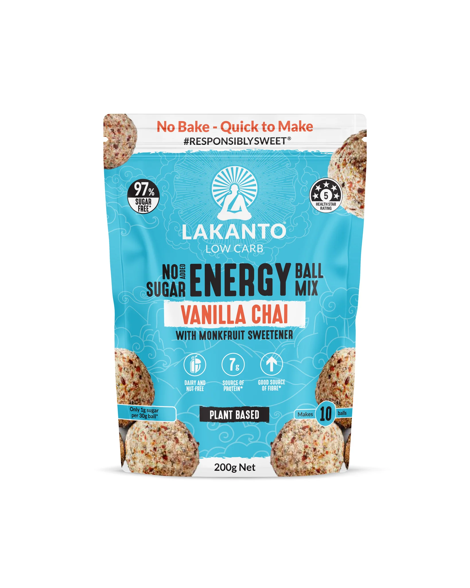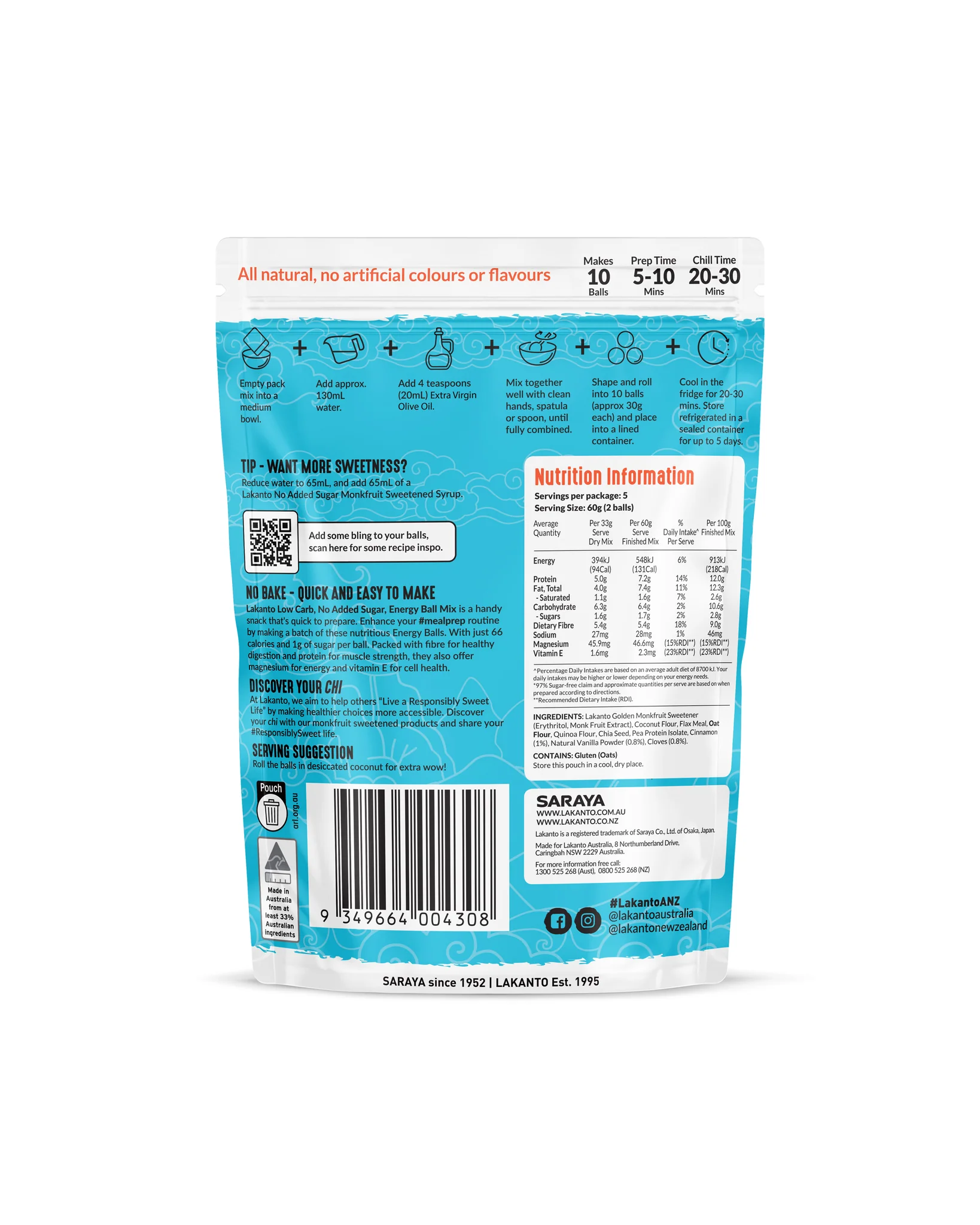 - Lakanto Low Carb, No Added Sugar, Energy Ball Mix is a handy snack that's quick to prepare. Enhance your #mealprep routine by making a batch of these nutritious Energy Balls. With just 66 calories and 1g of sugar per ball. Packed with fibre for healthy digestion and protein for muscle strength, they also offer magnesium for energy and vitamin E for cell health.