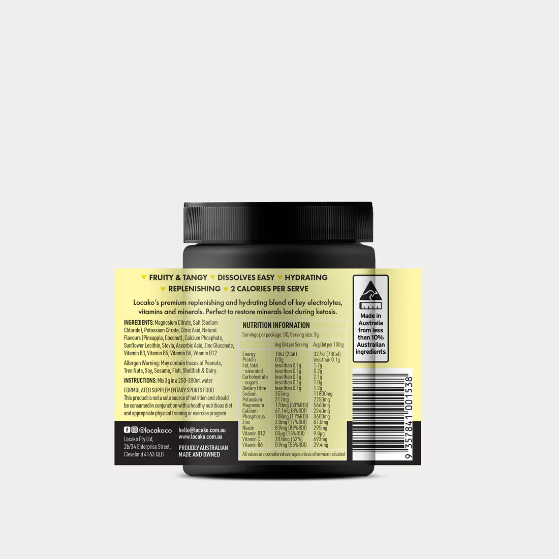 Magnesium Citrate, Salt (Sodium Chloride), Potassium Citrate, Citric Acid, Natural Flavours (Pineapple, Coconut), Calcium Phosphate, Sunflower Lecithin, Stevia, Ascorbic Acid, Zinc Gluconate, Vitamin B3, Vitamin B5, Vitamin B6, Vitamin B12.