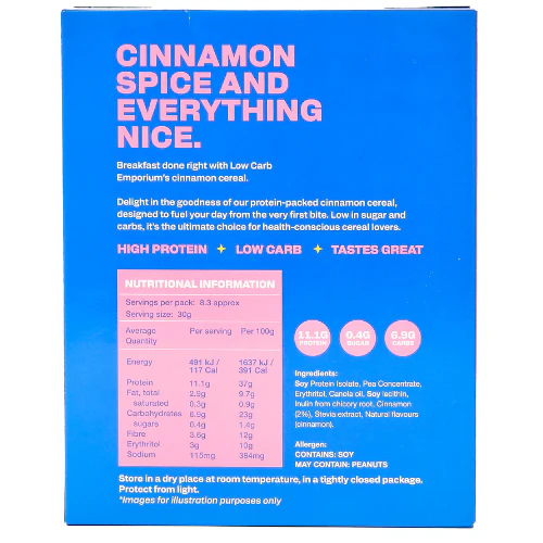 Breakfast done right with Low Carb Emporium’s cinnamon cereal. Delight in the goodness of our protein-packed cinnamon cereal, designed to fuel your day from the very first bite. Low in sugar and carbs, it's the ultimate choice for health-conscious cereal lovers.