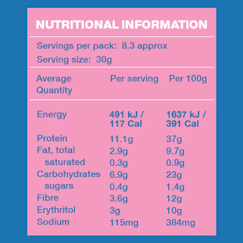 Ingredients: Soy Protein Isolate, Pea Concentrate, Erythritol, Canola oil, Soy lecithin, Inulin from chicory root, Cinnamon (2%), Stevia extract, Natural flavours (cinnamon).