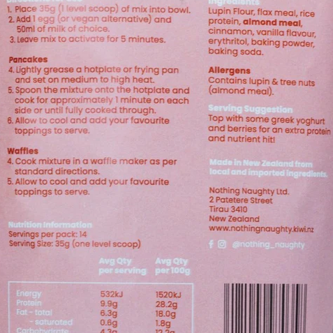 Ingredients: Lupin Flour, flax meal, rice protein, almond meal, cinnamon, vanilla flavour, erythritol, baking powder.