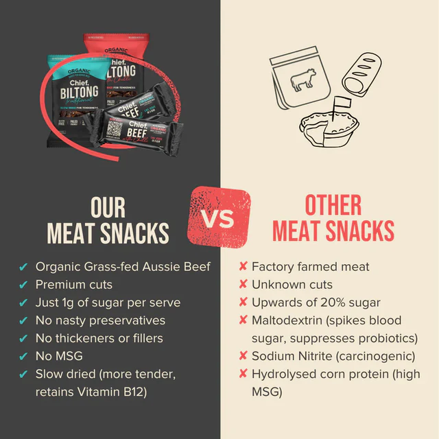Unlike most jerky, we naturally preserve our biltong just as our ancestors did with no added nitrates or nitrites (carcinogenic preservatives). We also don't use cheap fillers like maltodextrin or hydrolysed vegetable proteins (high in MSG). A lot of jerky is surprisingly high in sugar (upwards of 25%!) but our products have less sugar than a carrot. And because they're slow dried they're much more tender than jerky and retain over 90% of heat sensitive vitamins such as B12. Better is an understatement.